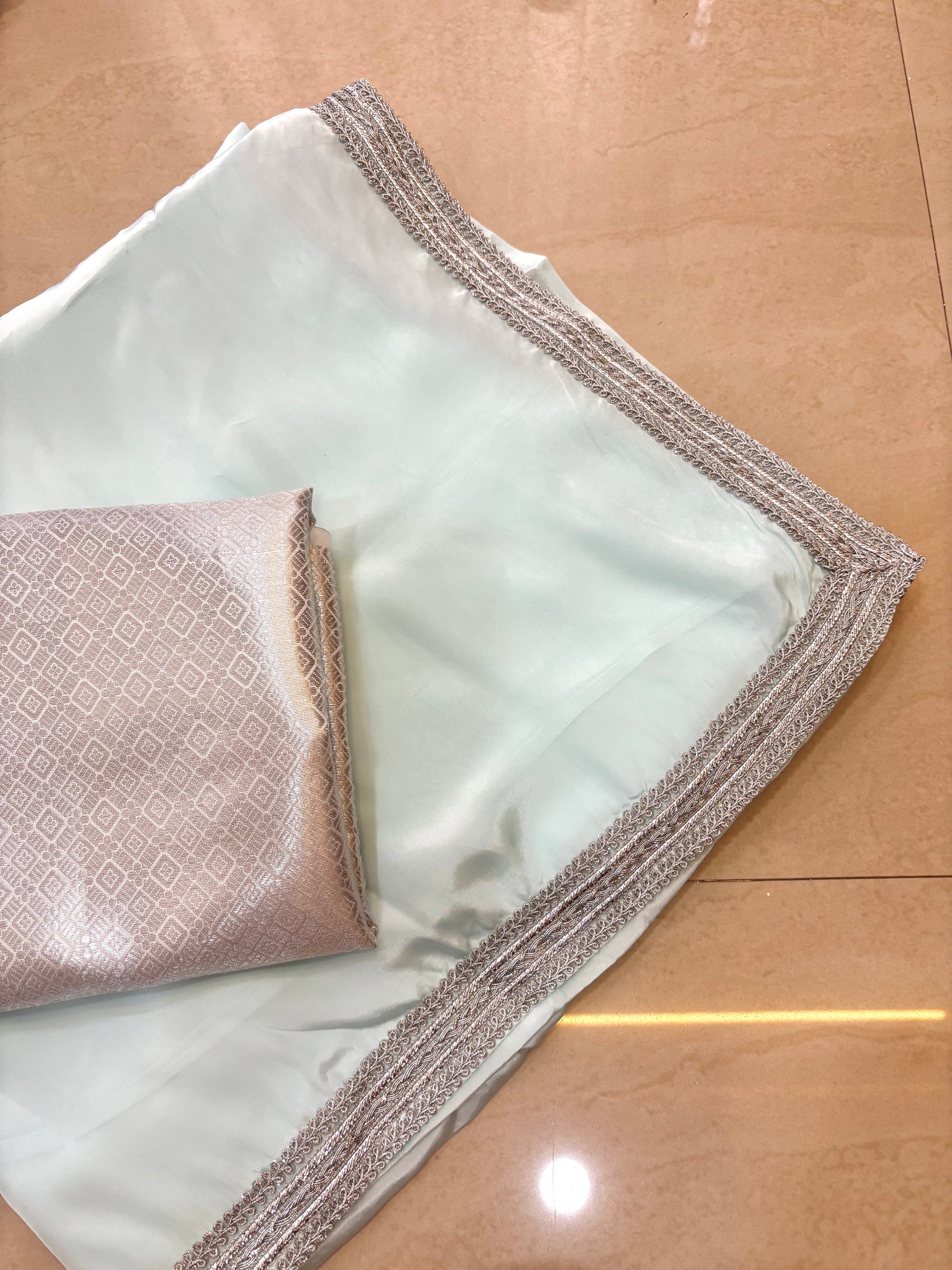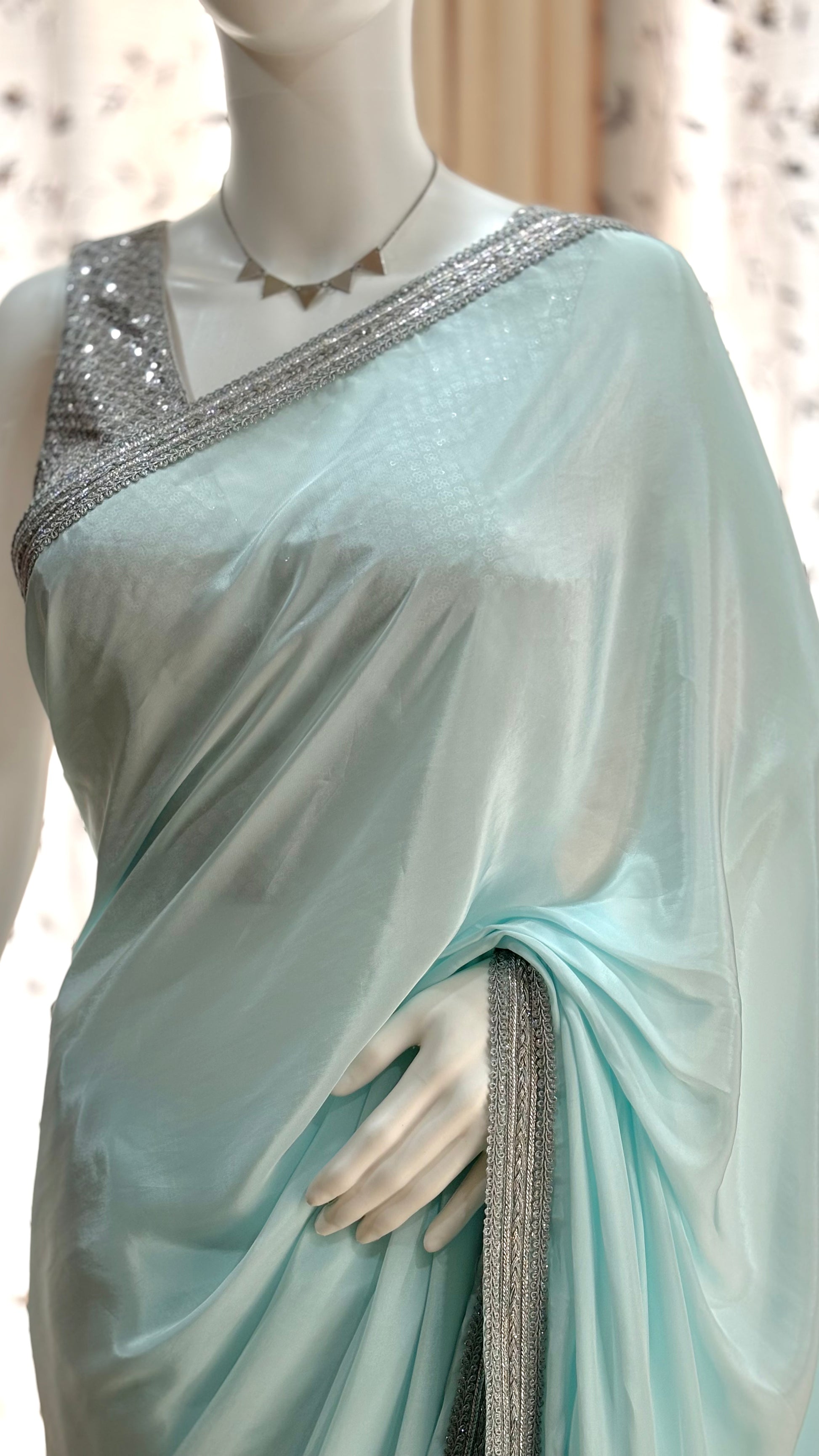 Ice blue silk saree with silver lace border and contrast silver blouse piece