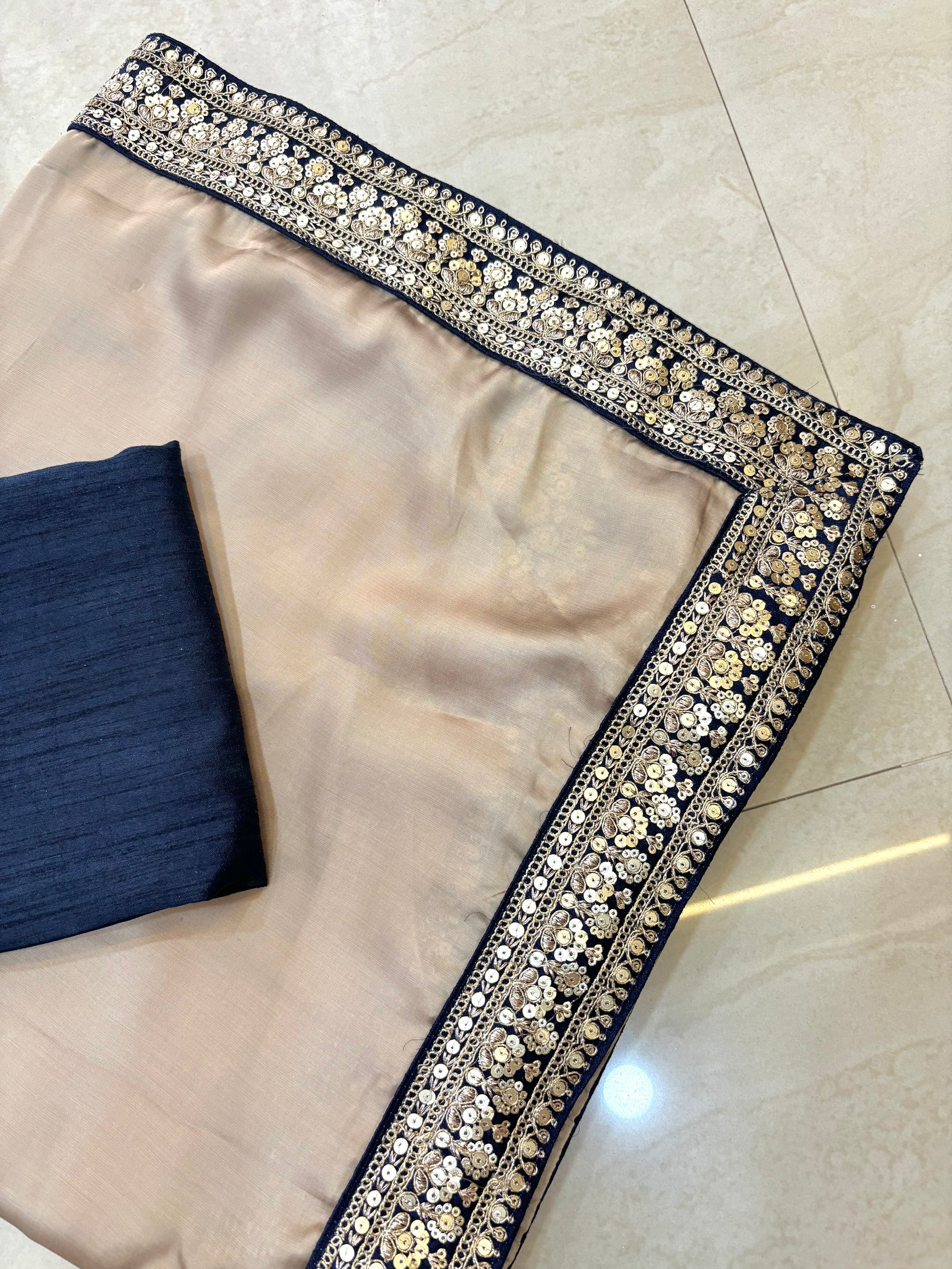 Beige cotton silk saree with contrast navy blue lace border detailing and navy blue contrast blouse piece