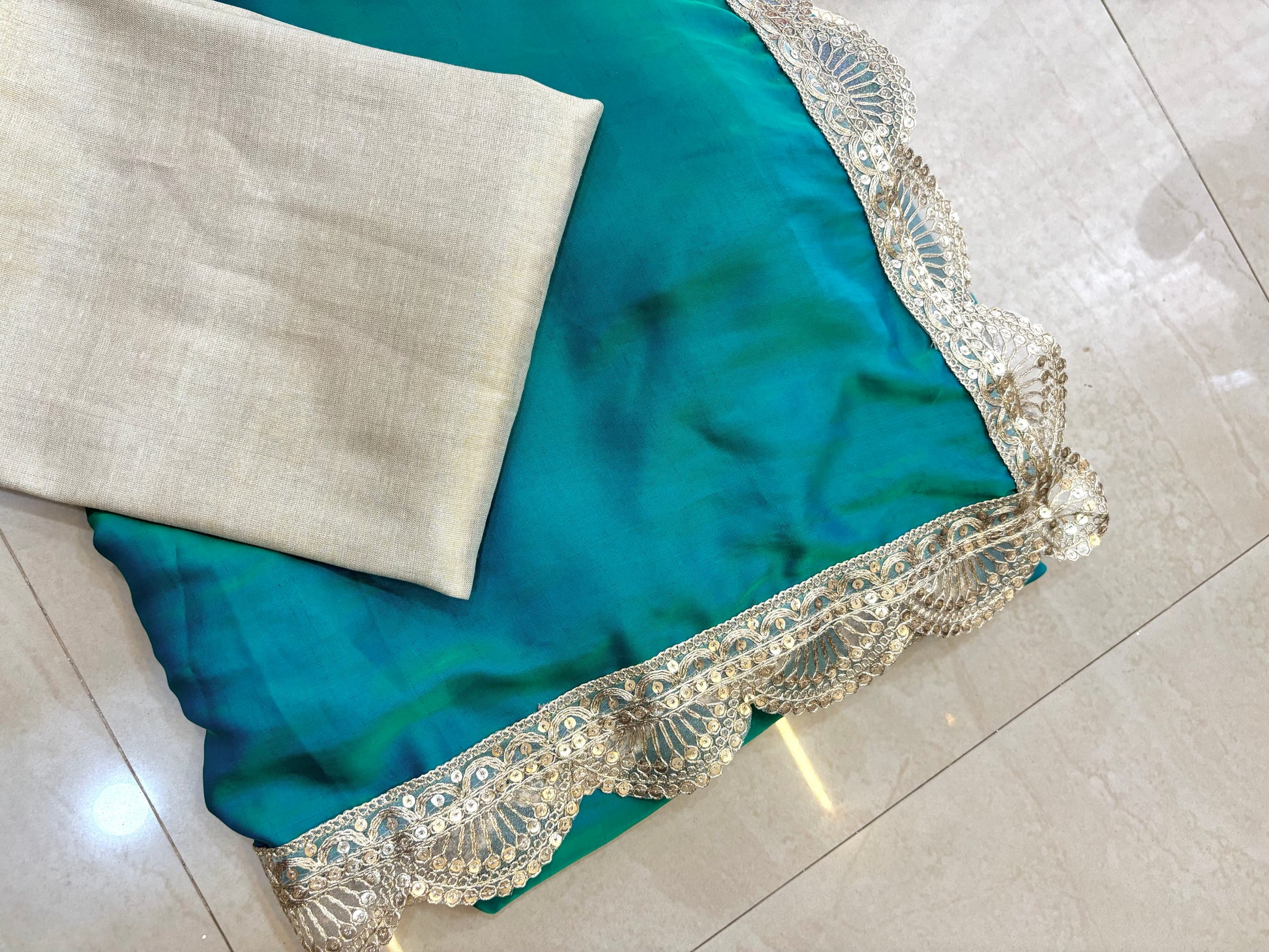 Cotton silk two toned saree with scallop lace border and golden contrast blouse piece