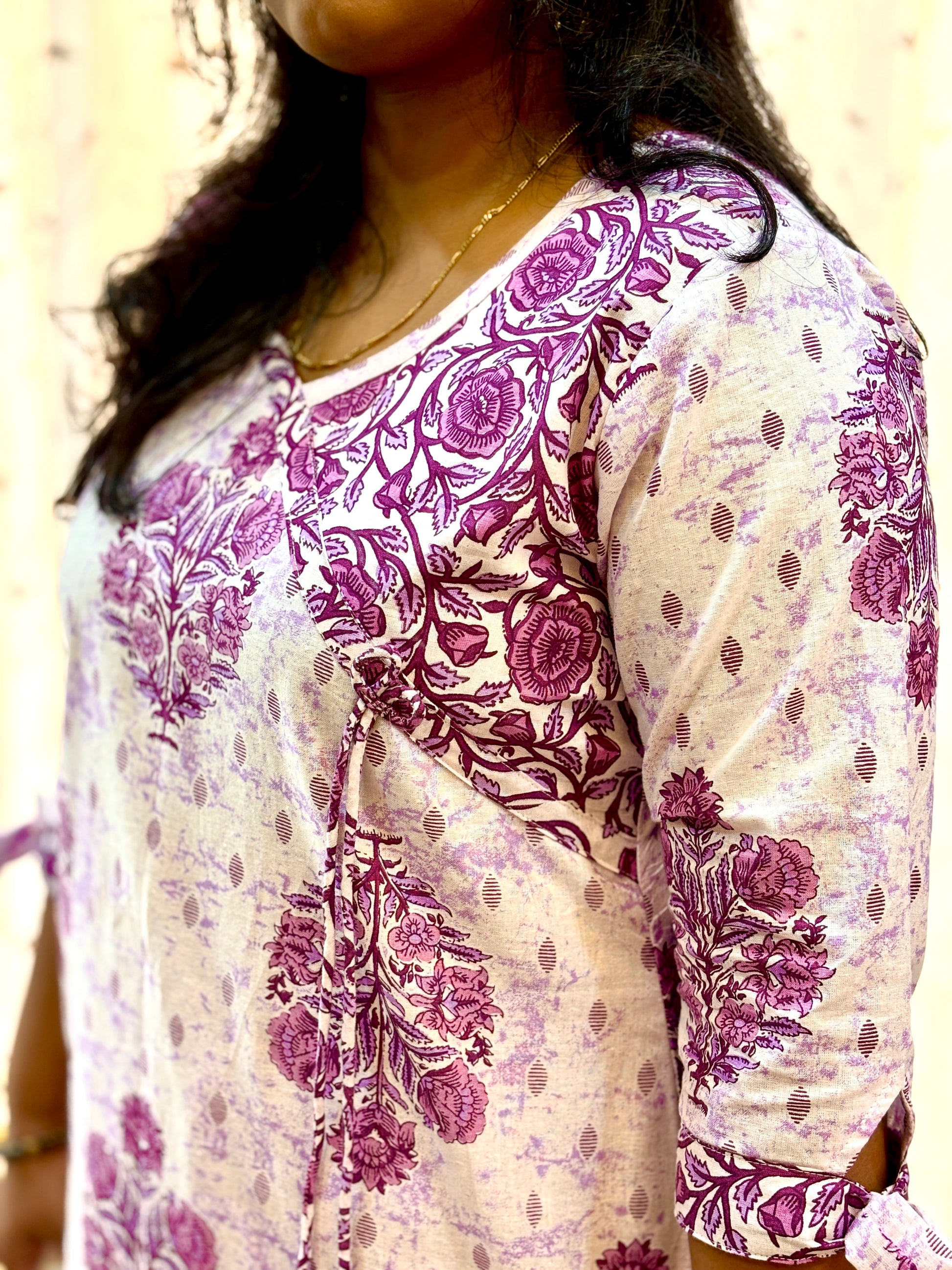 Charming lavender floral suit set with delicate prints with angarkha style neck line and bow-detailed sleeves.