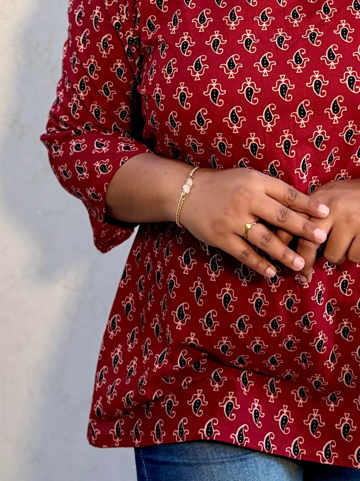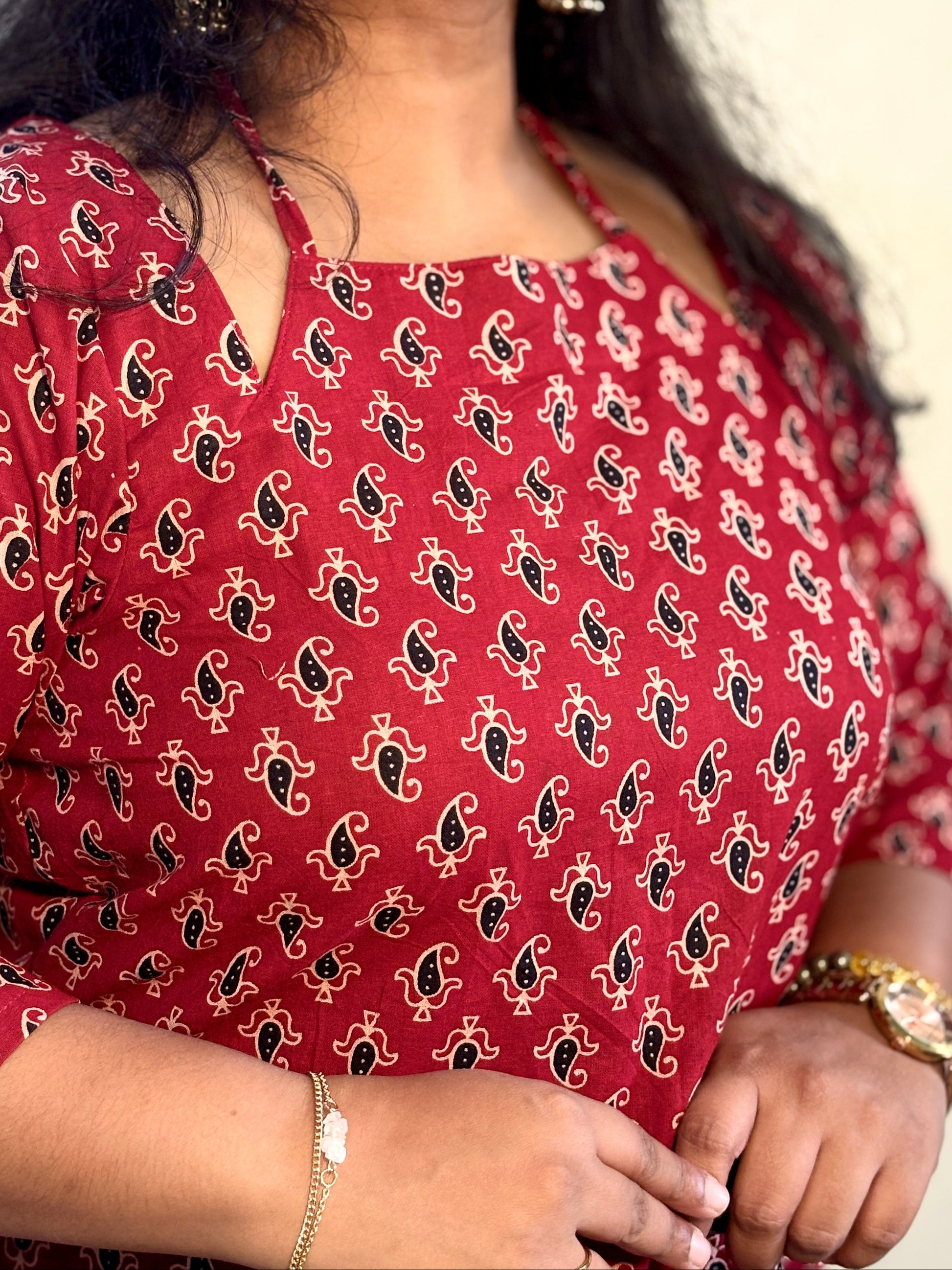 Crafted with dusty red hues and traditional ajrakh butti prints — featuring a modern neckline for a contemporary ethnic fusion.
