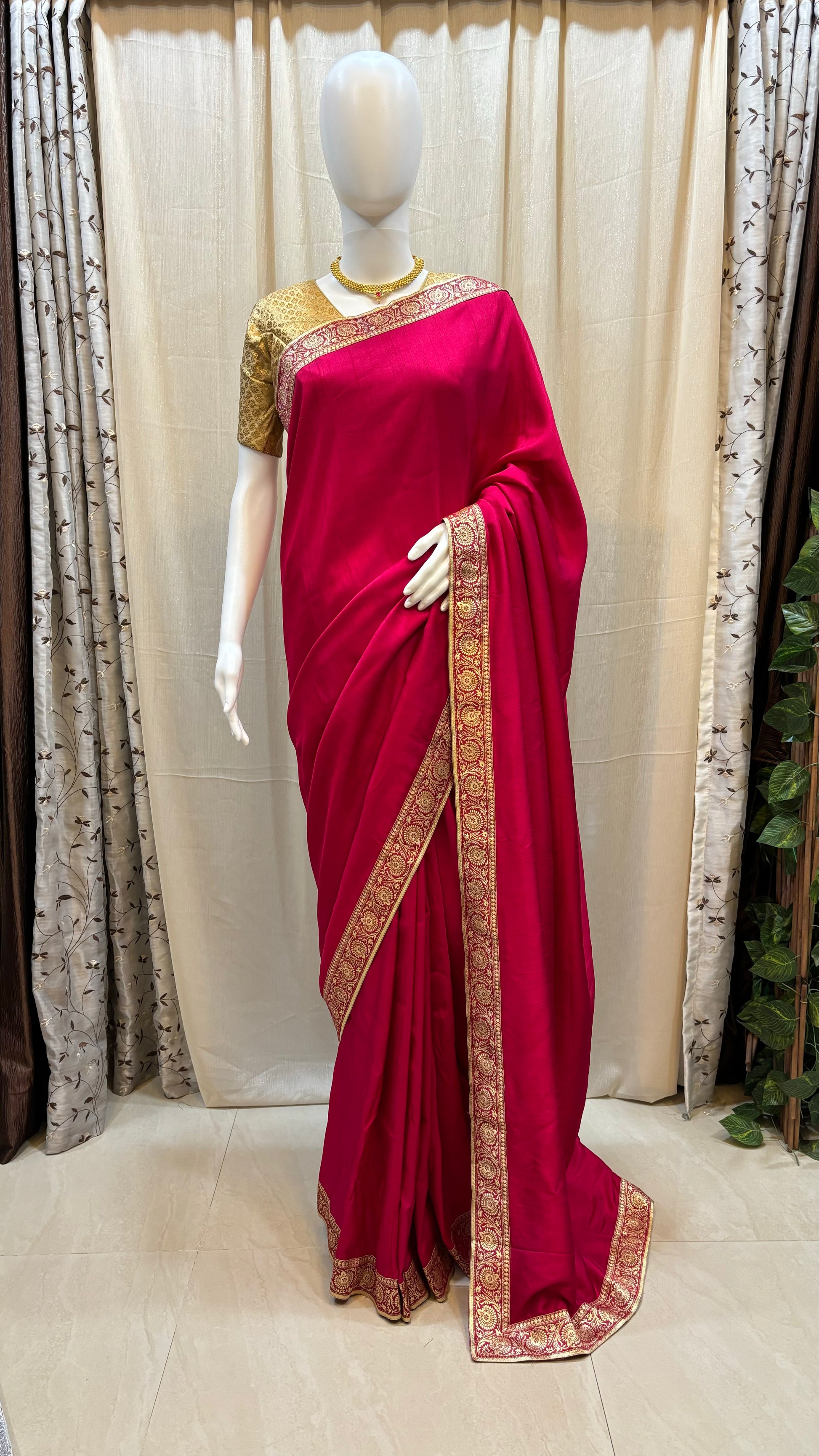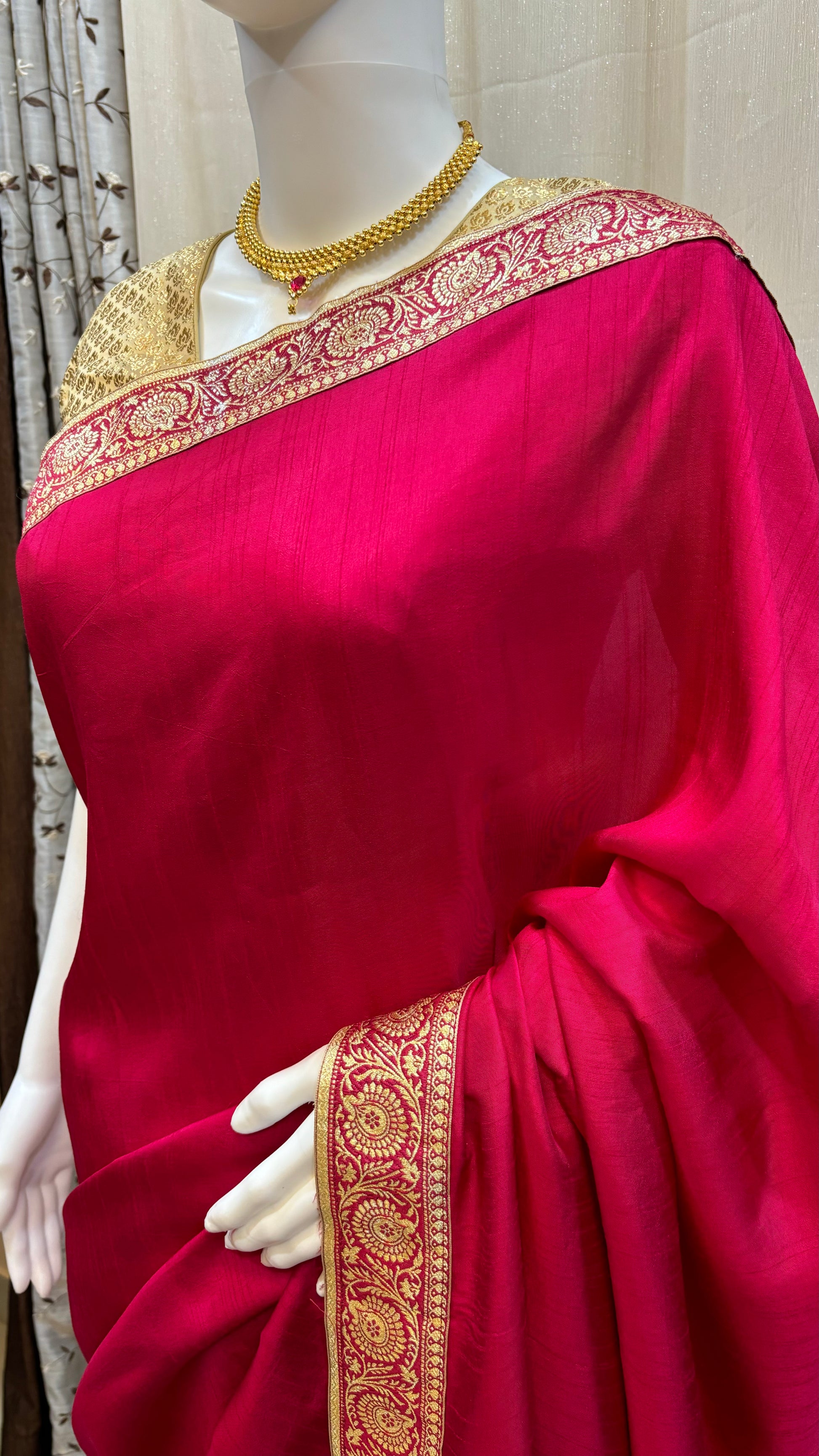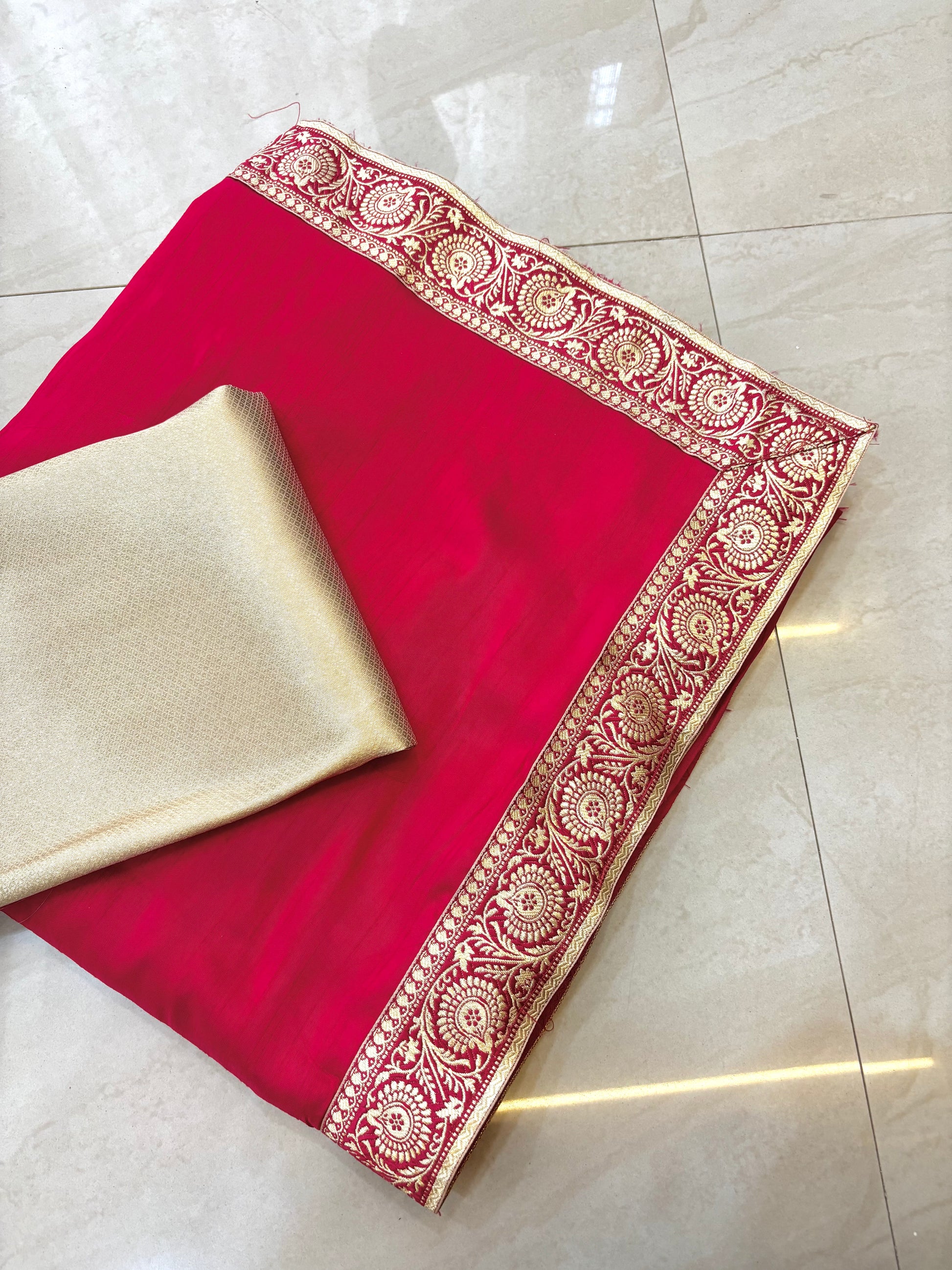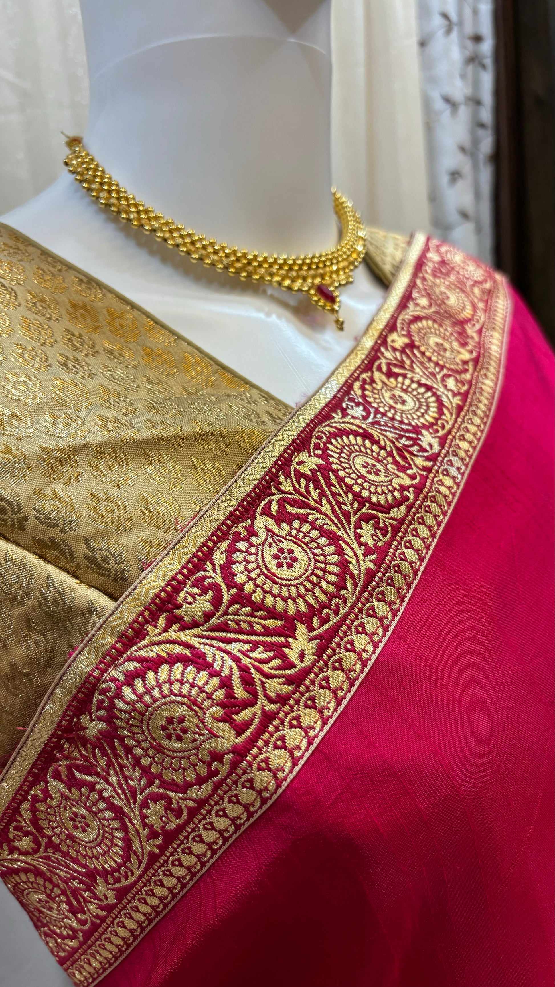 Crimson raw silk saree with brocade lace border and contrast golden blouse piece