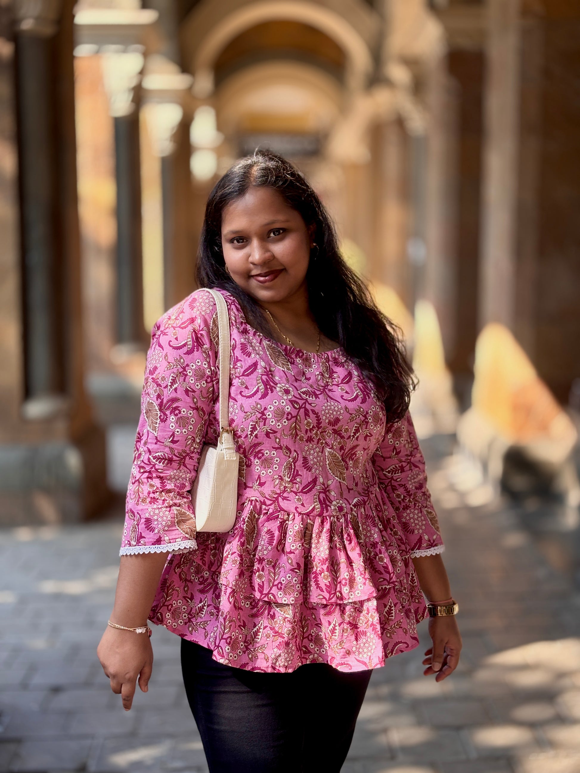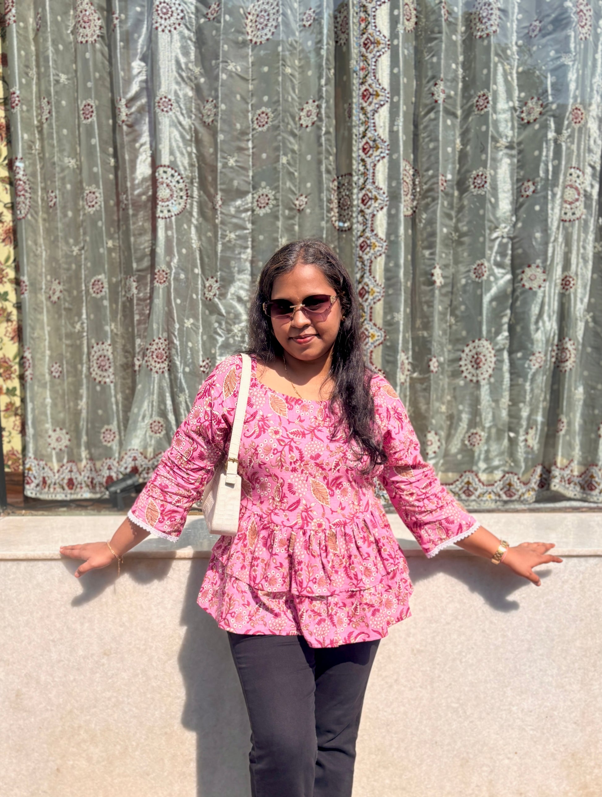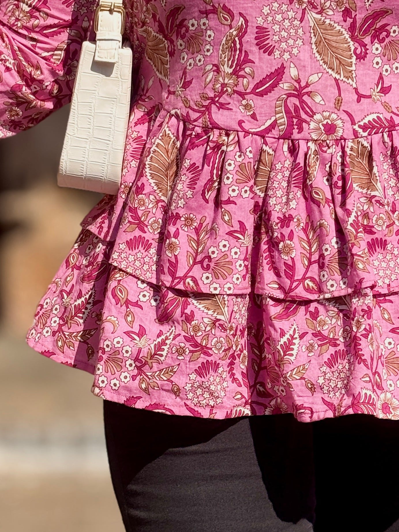 Crafted with soft floral motifs and feminine tiered detailing — a breezy silhouette designed for effortless elegance.