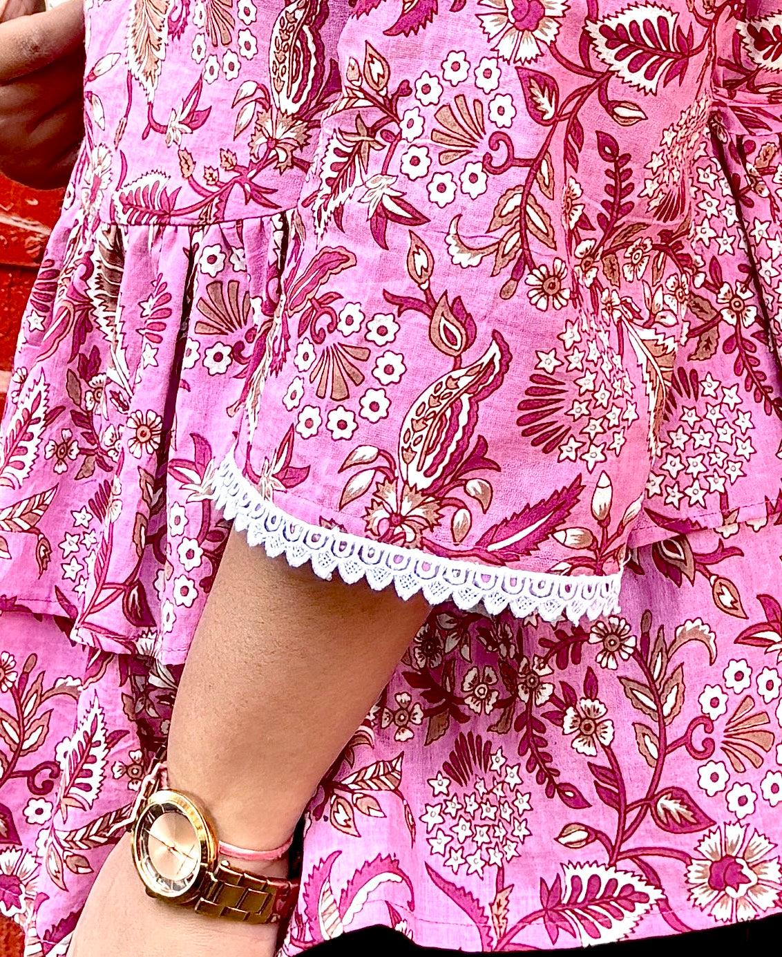 Technical Details: Round Neck, Three-Quarter Sleeves with Lace Trim, Tie-up Back for customized fitting, Tiered Flare