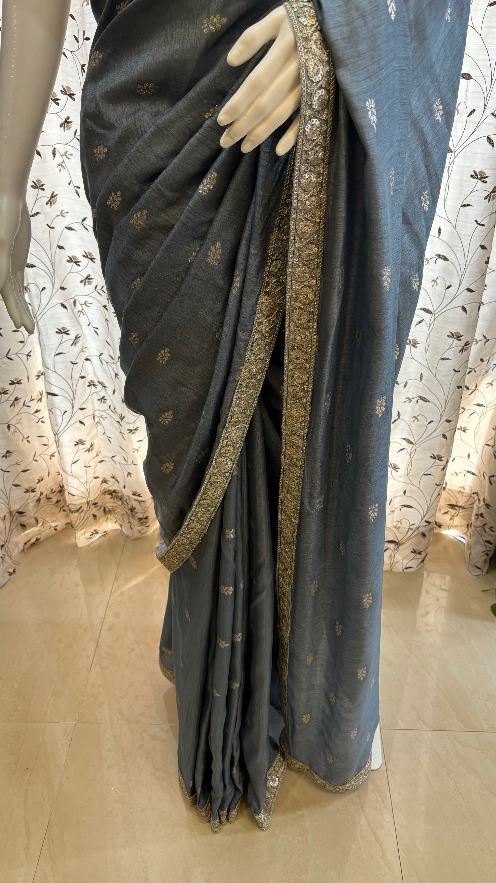 Grey raw silk saree with all over buttis with lace border and contrast silver blouse piece